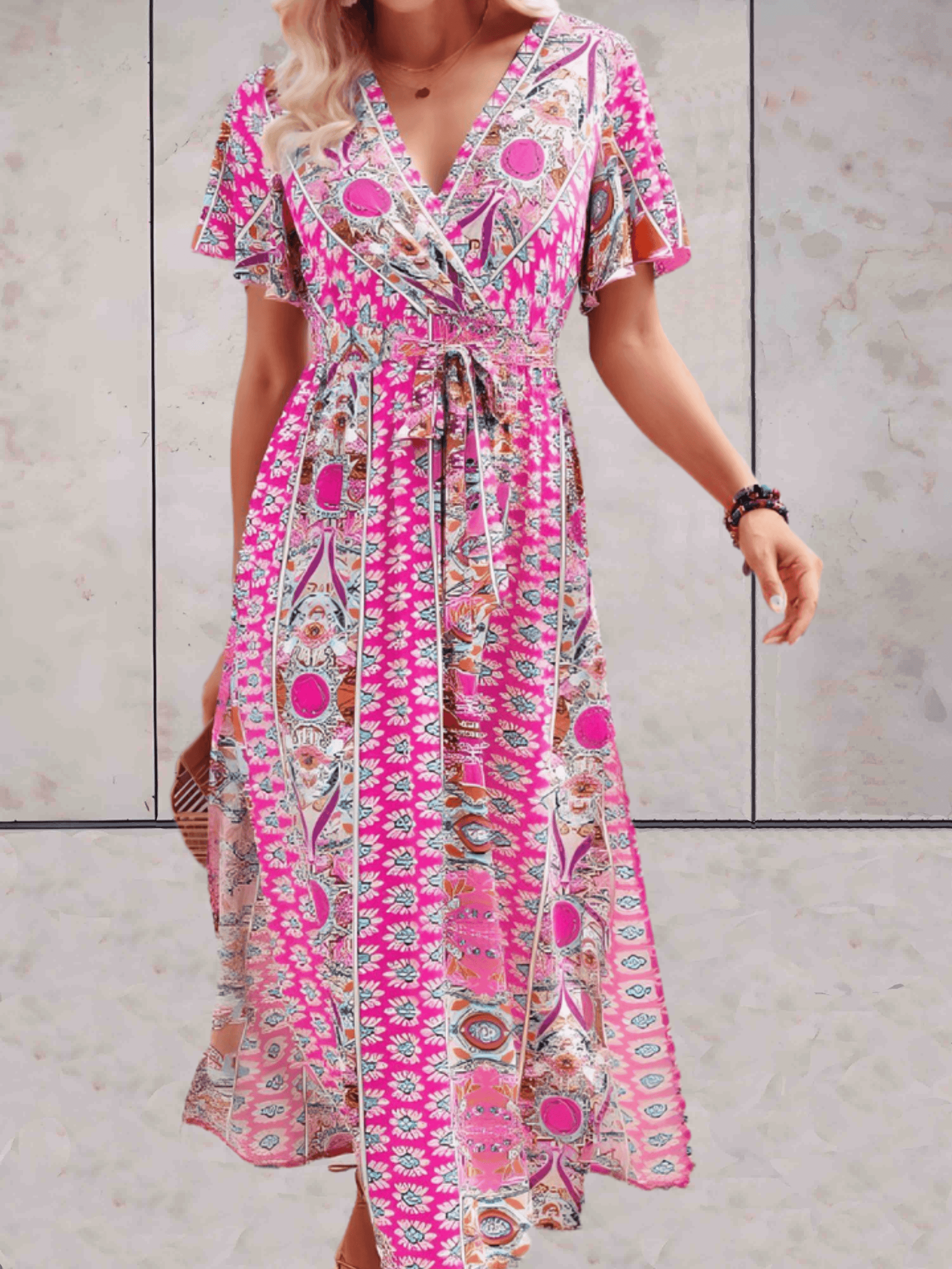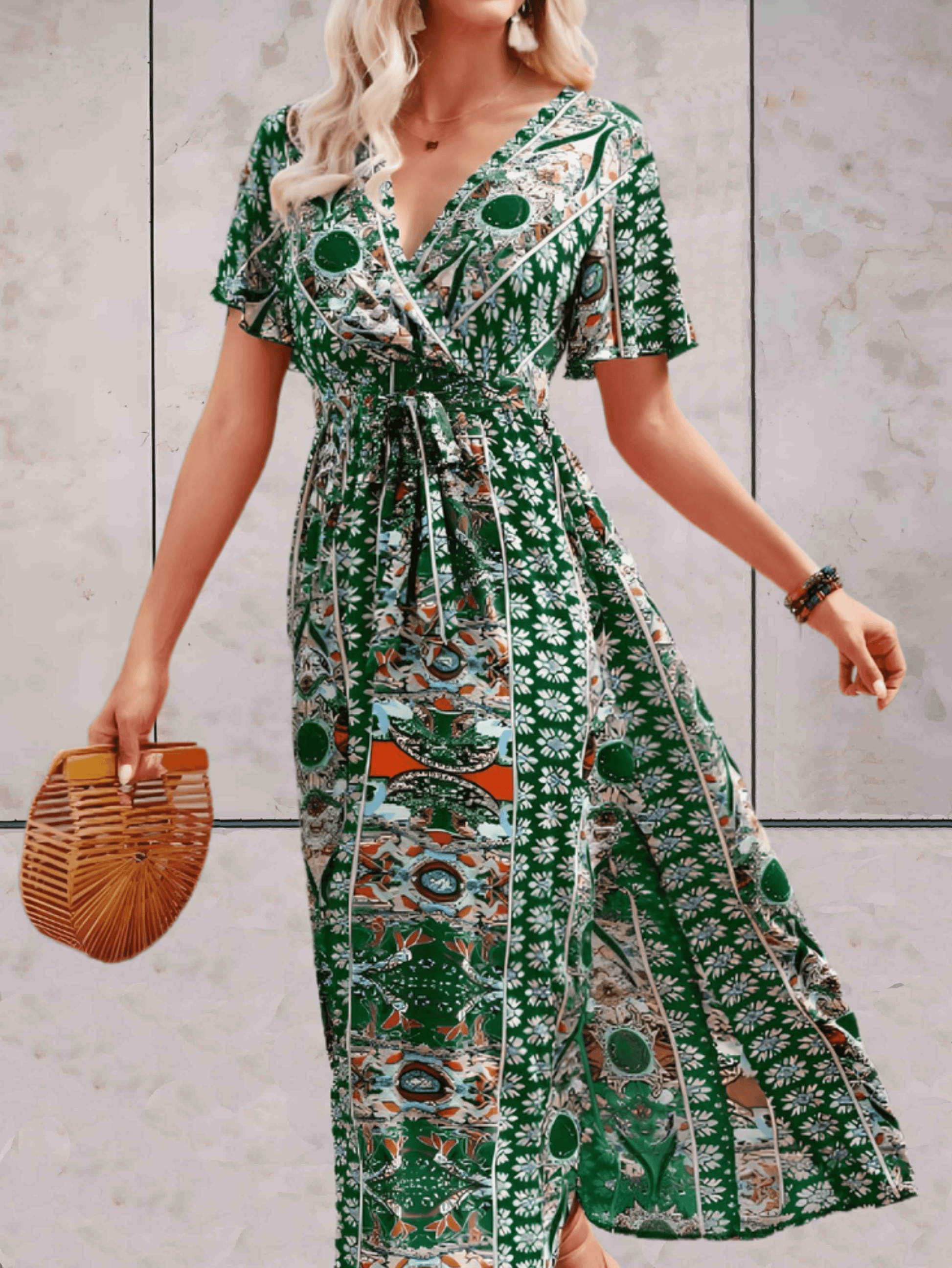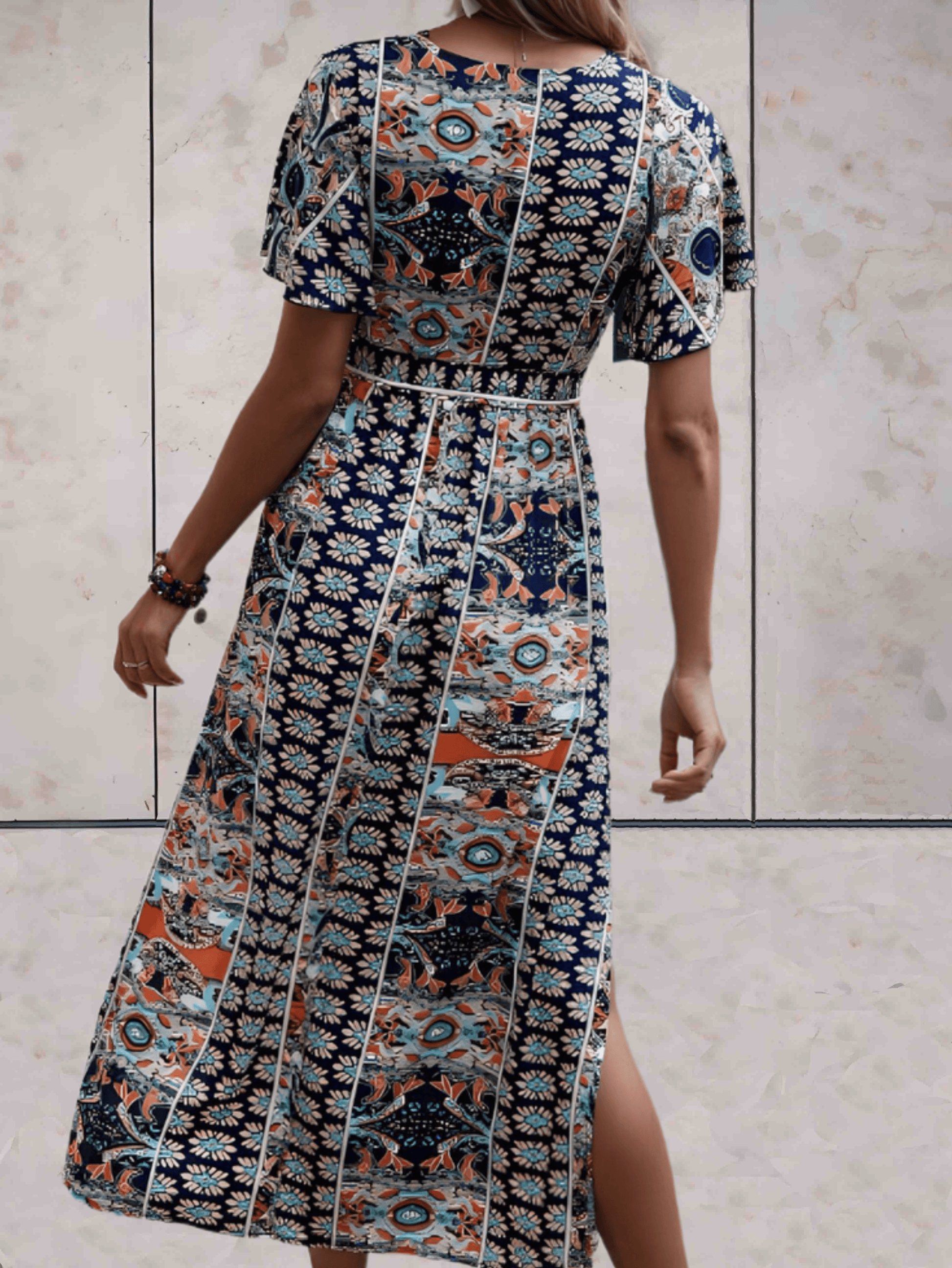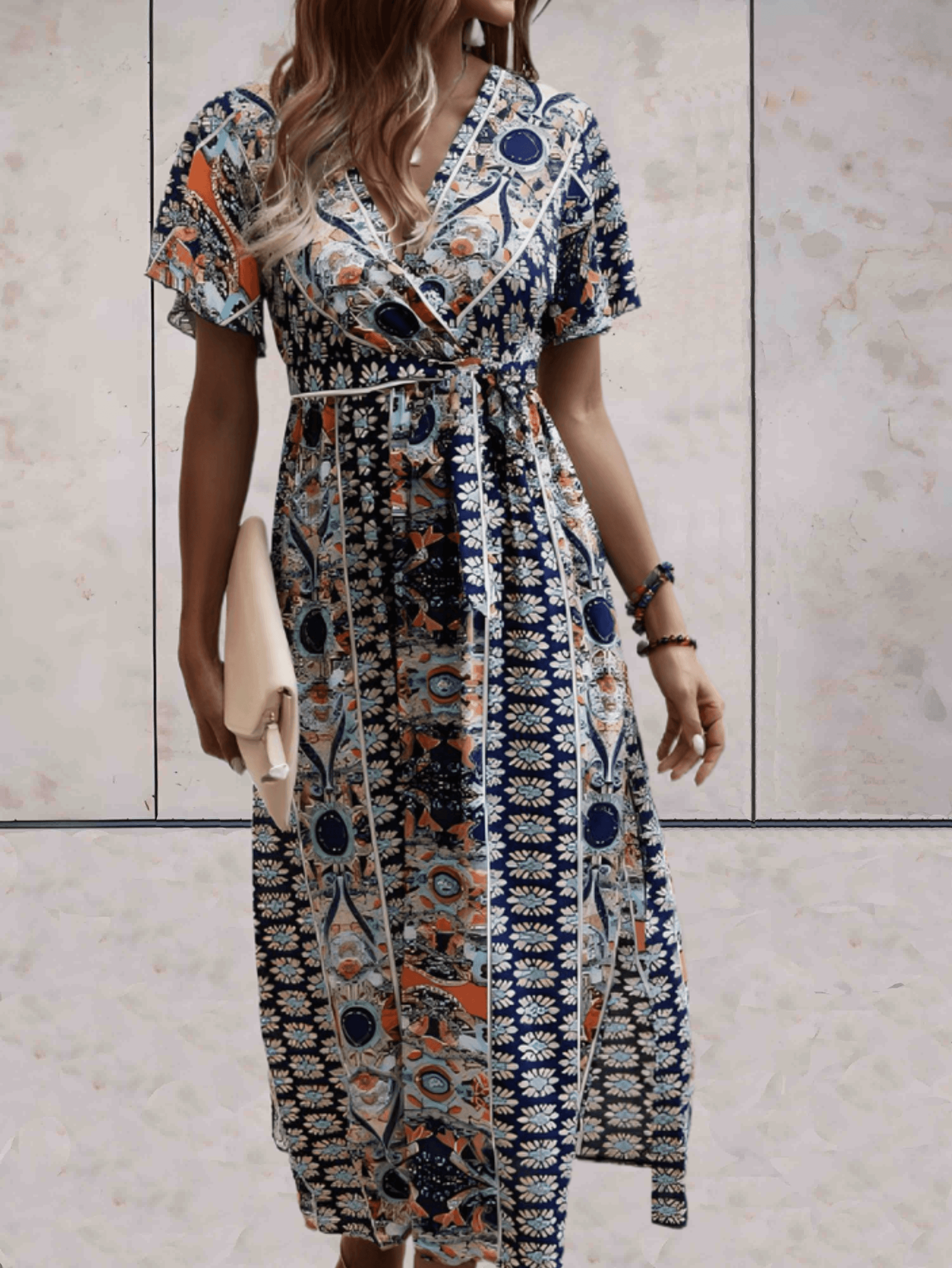 Notre charmante robe portefeuille à col en V et manches courtes est le choix parfait pour toute occasion. La robe impressionne par son motif unique et sa coupe fluide qui crée une silhouette élégante et féminine. La fente haute ajoute une touche attrayante tout en offrant une liberté de mouvement. Grâce à la ceinture à nouer, vous pouvez ajuster la coupe individuellement et compléter votre look avec style. Que vous passiez une journée en ville ou assistiez à une soirée, cette robe polyvalente promet de vous garder élégante et confortable.