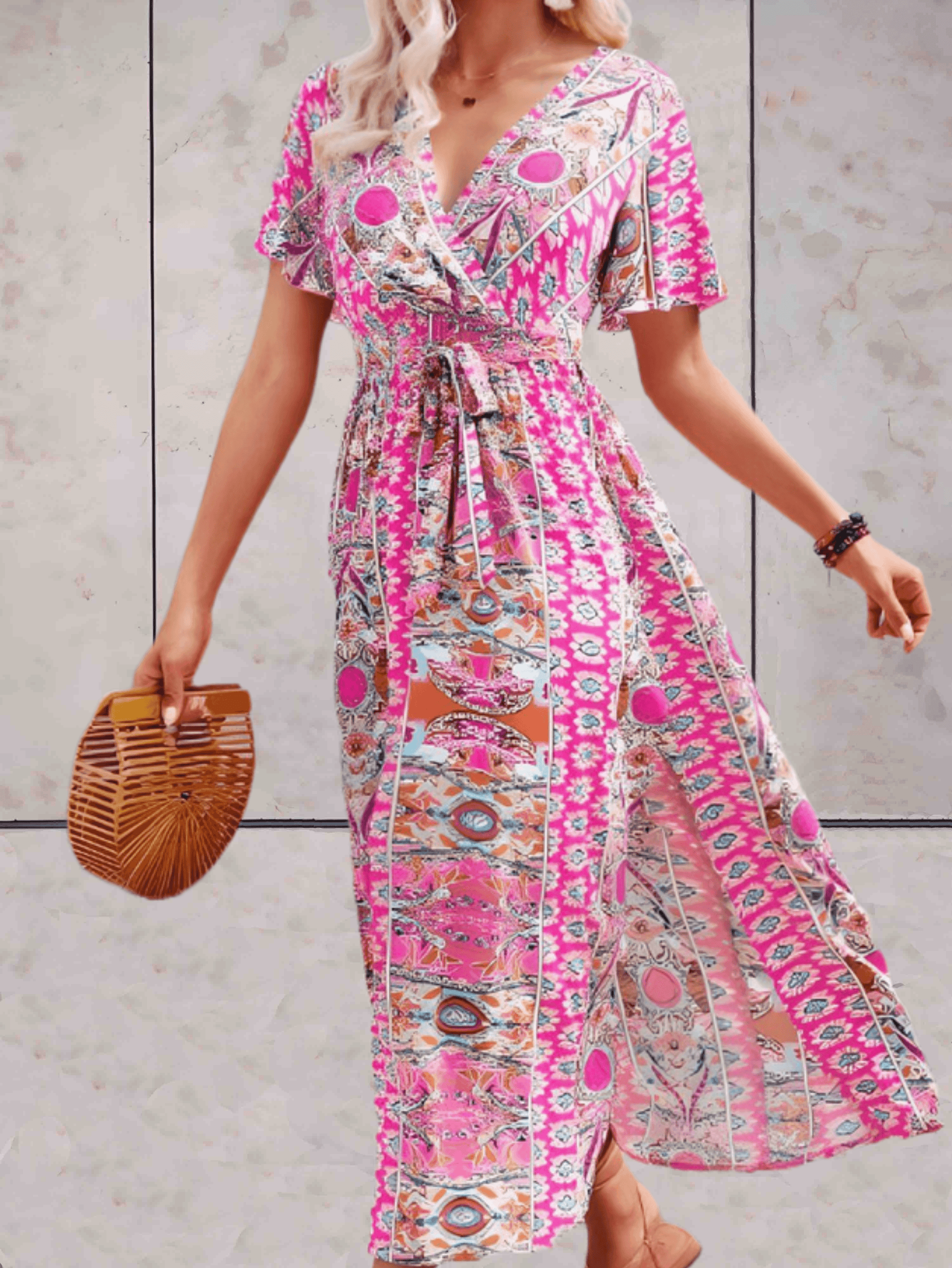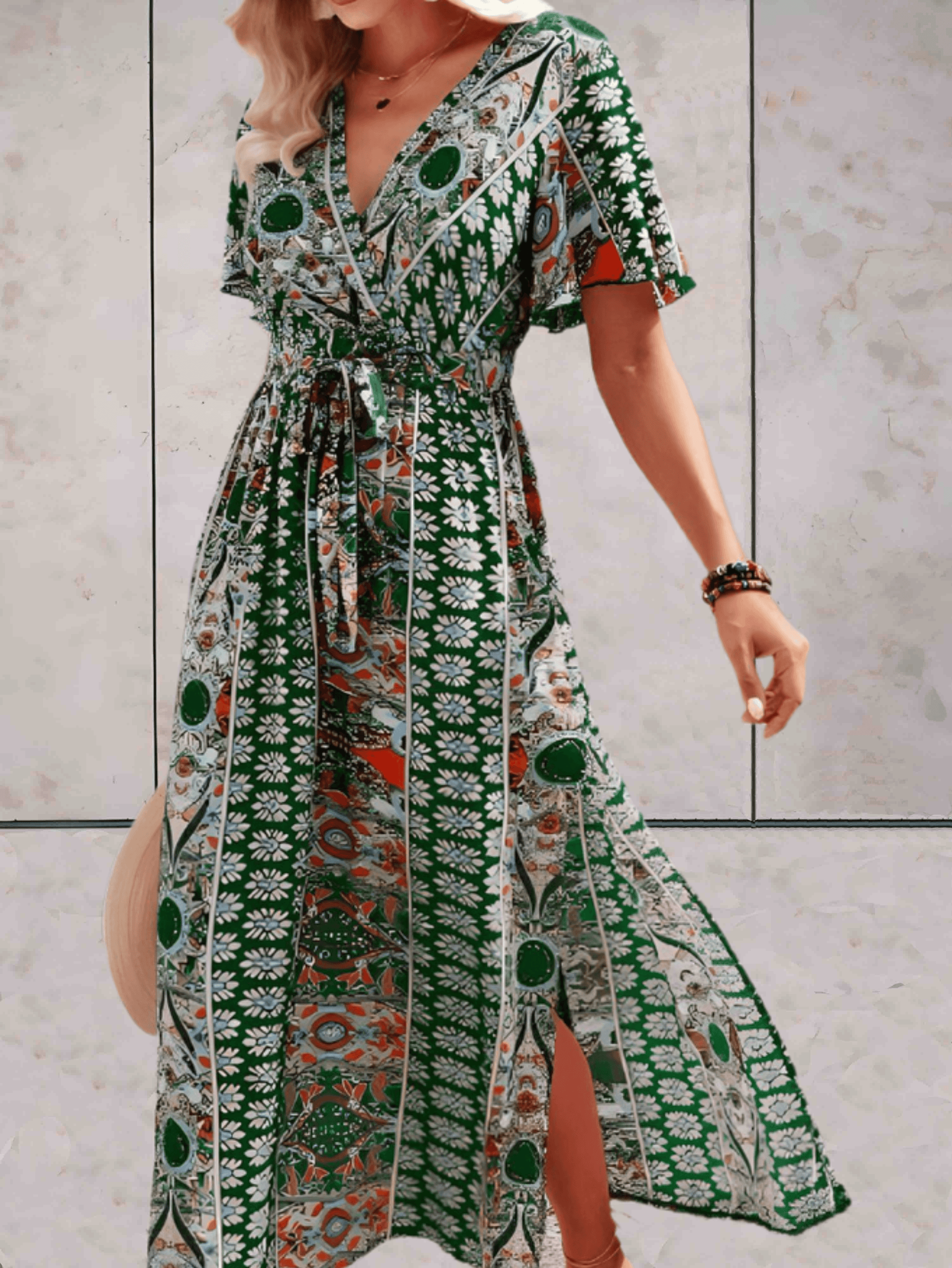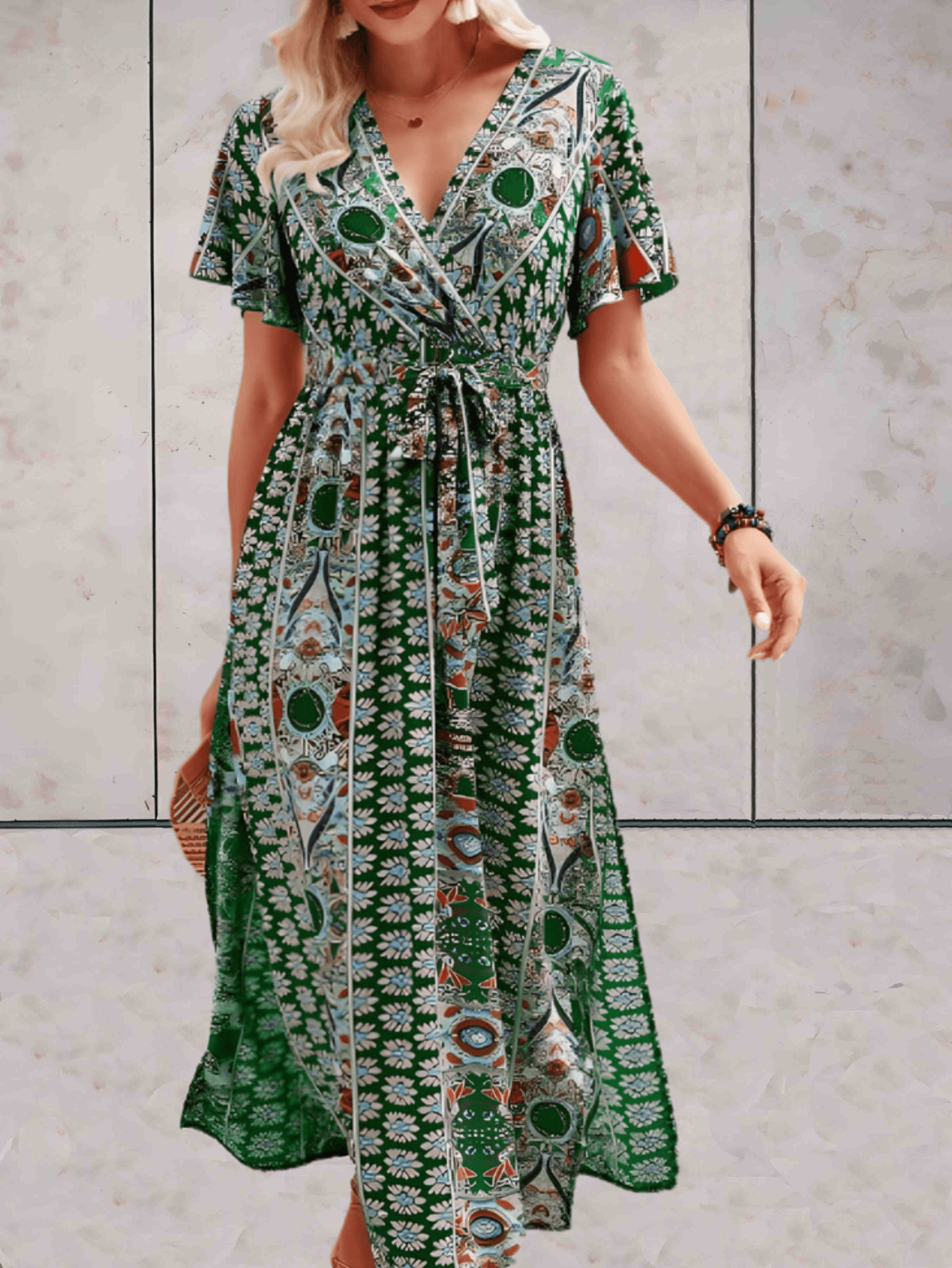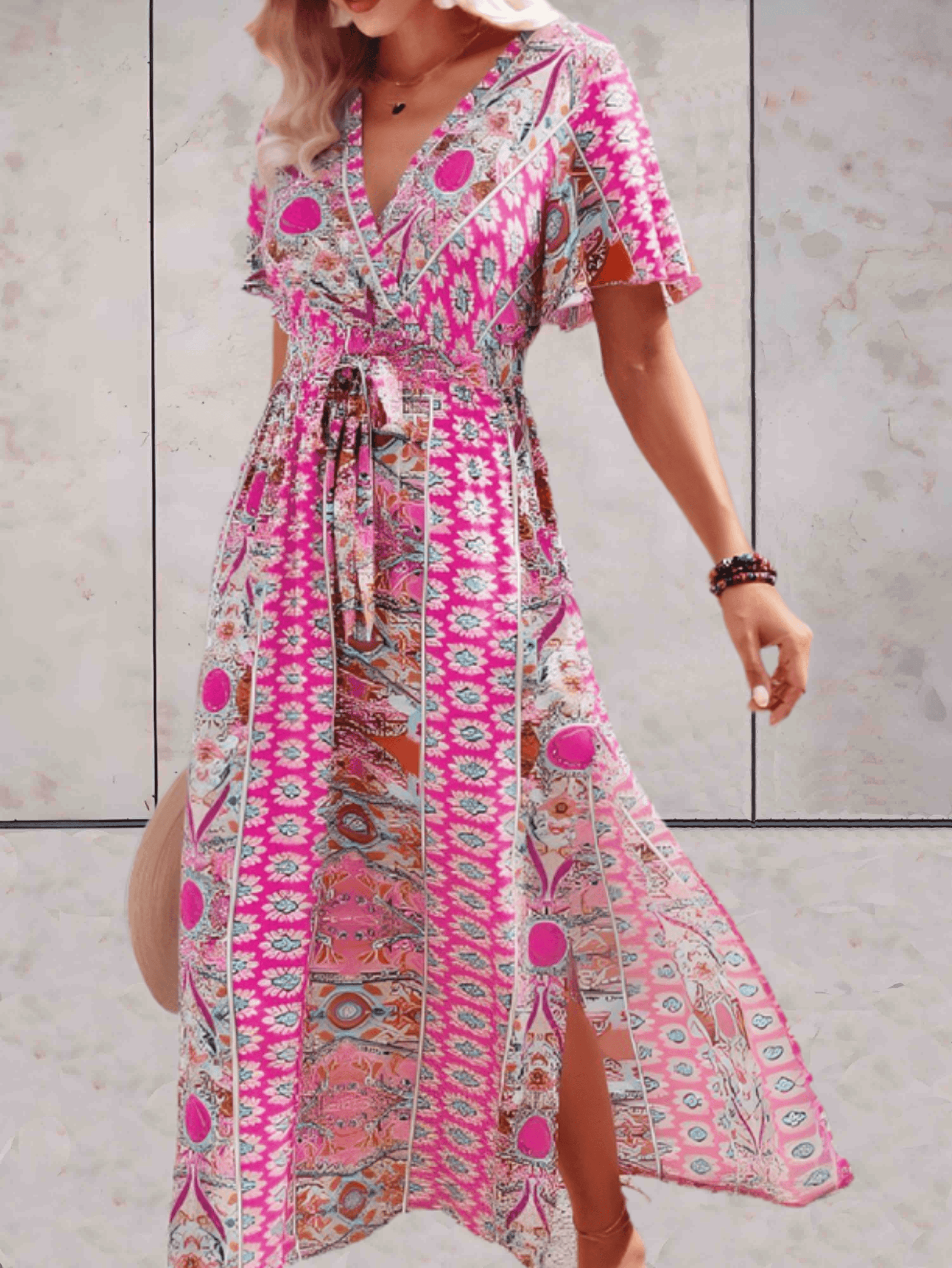 Notre charmante robe portefeuille à col en V et manches courtes est le choix parfait pour toute occasion. La robe impressionne par son motif unique et sa coupe fluide qui crée une silhouette élégante et féminine. La fente haute ajoute une touche attrayante tout en offrant une liberté de mouvement. Grâce à la ceinture à nouer, vous pouvez ajuster la coupe individuellement et compléter votre look avec style. Que vous passiez une journée en ville ou assistiez à une soirée, cette robe polyvalente promet de vous garder élégante et confortable.