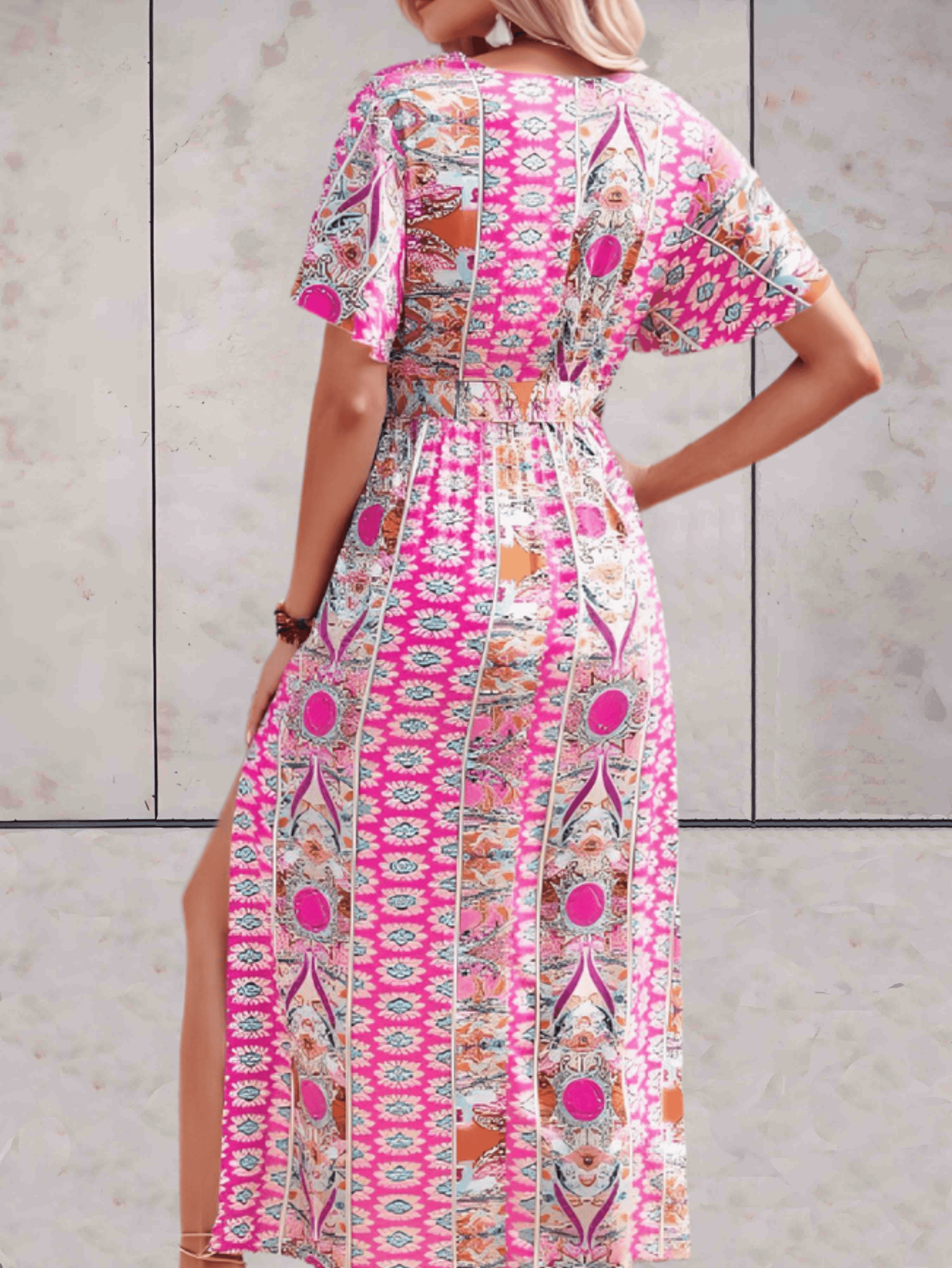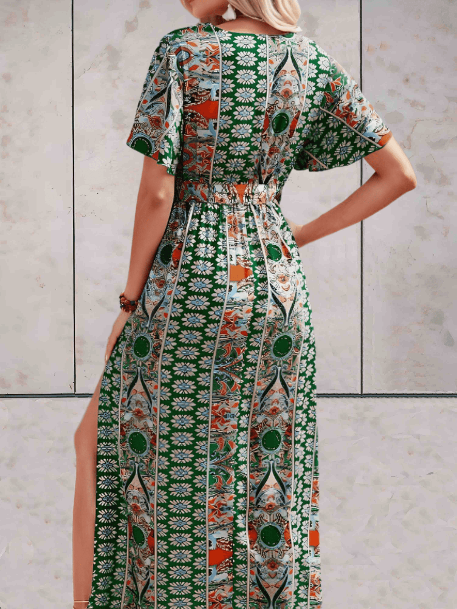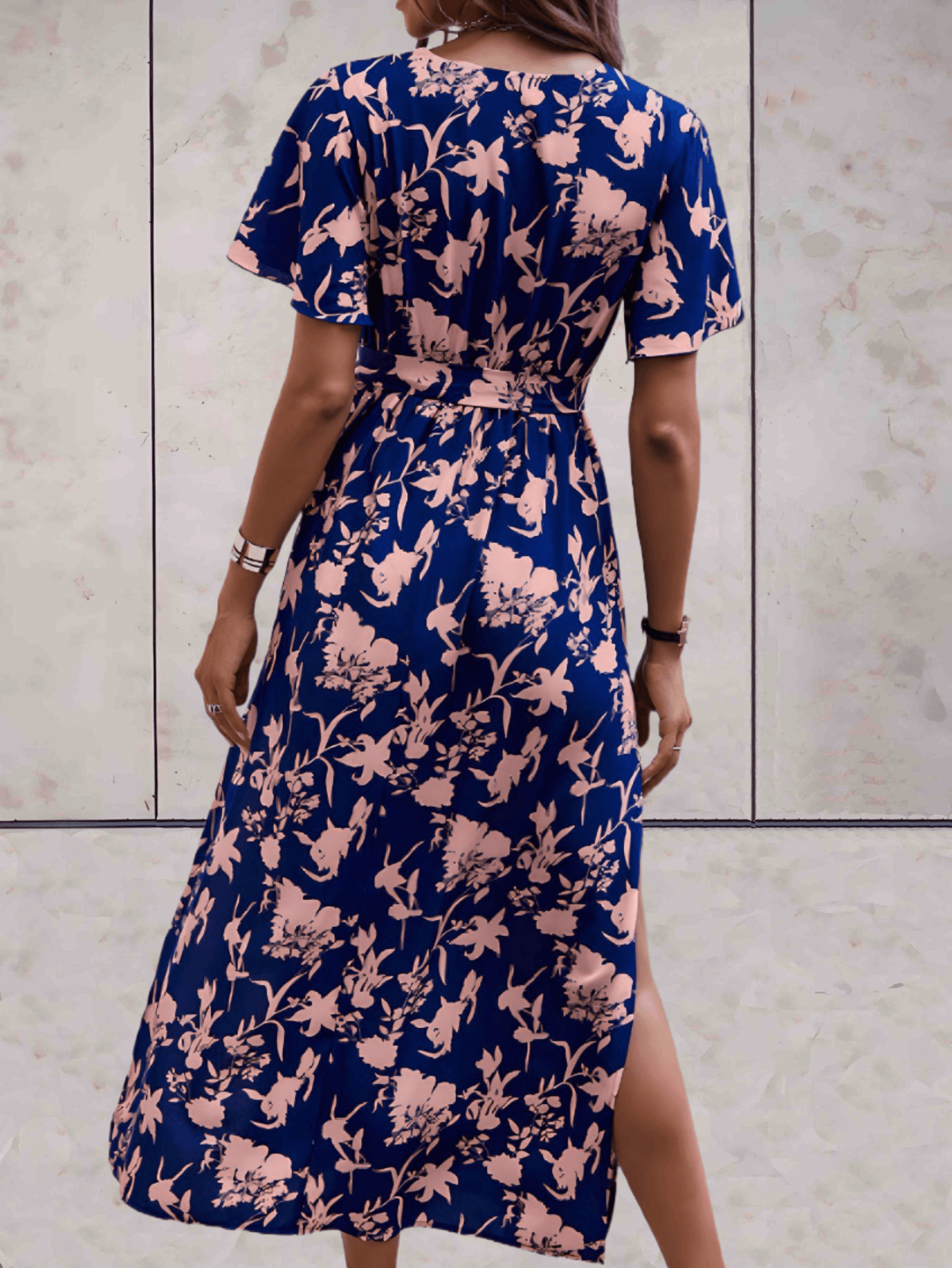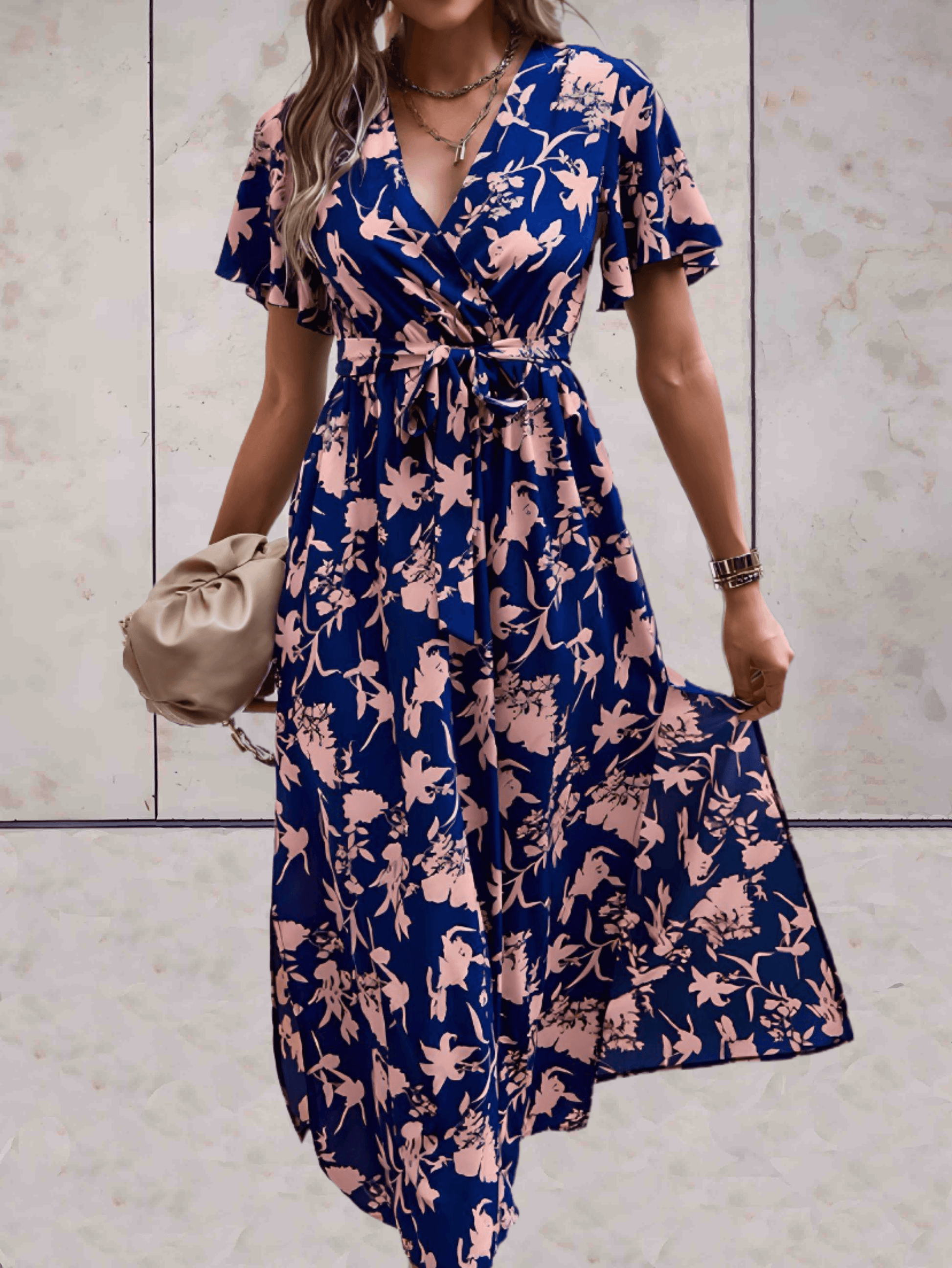 Notre charmante robe portefeuille à col en V et manches courtes est le choix parfait pour toute occasion. La robe impressionne par son motif unique et sa coupe fluide qui crée une silhouette élégante et féminine. La fente haute ajoute une touche attrayante tout en offrant une liberté de mouvement. Grâce à la ceinture à nouer, vous pouvez ajuster la coupe individuellement et compléter votre look avec style. Que vous passiez une journée en ville ou assistiez à une soirée, cette robe polyvalente promet de vous garder élégante et confortable.