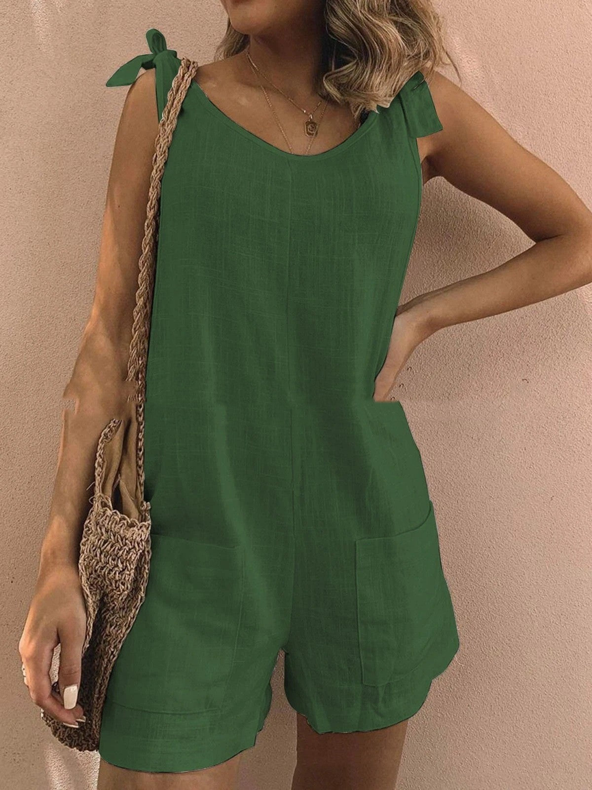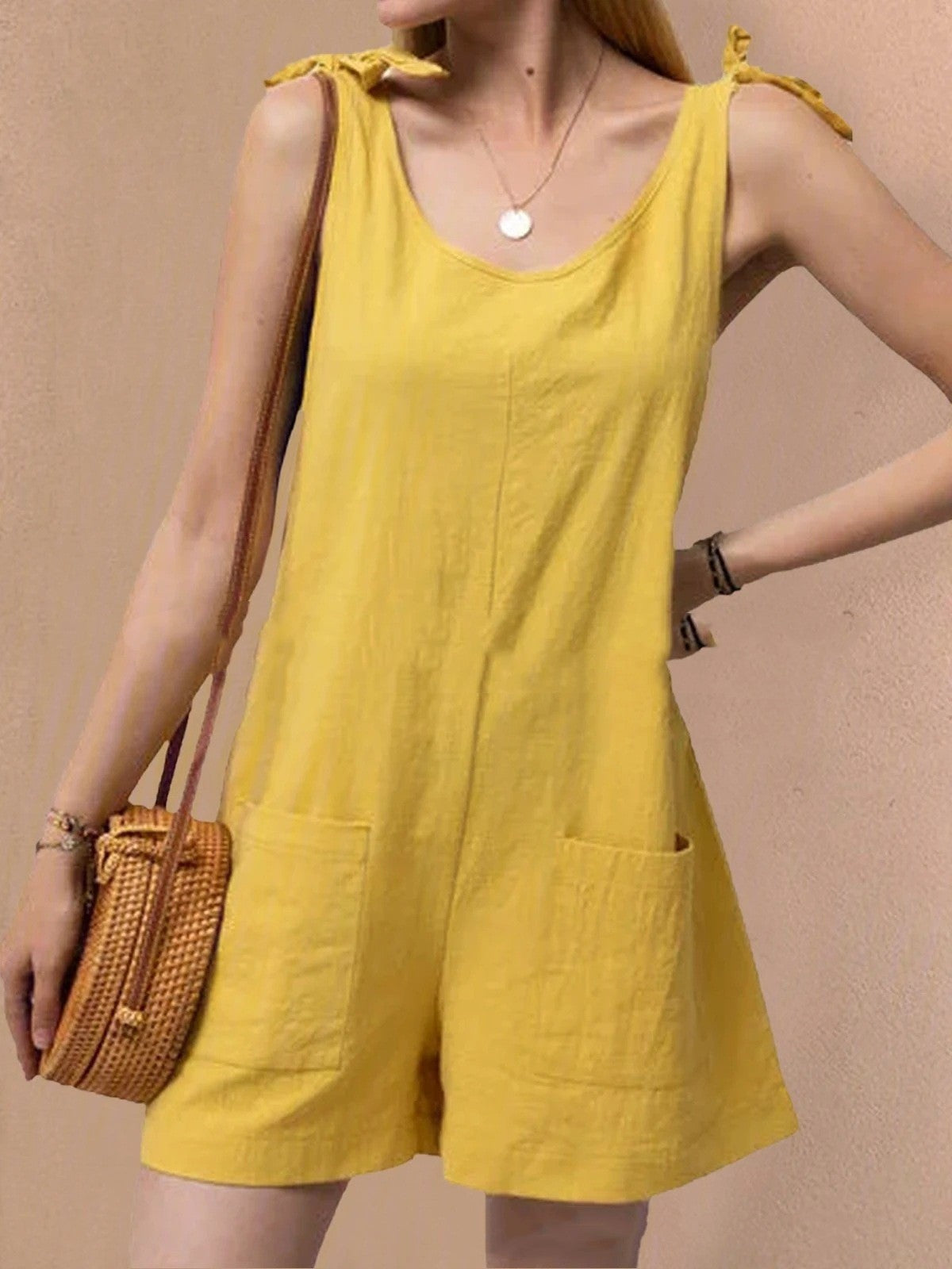 • Design : Combinaison sans manches avec encolure dégagée, bretelles à nouer et poches plaquées sur le devant.
