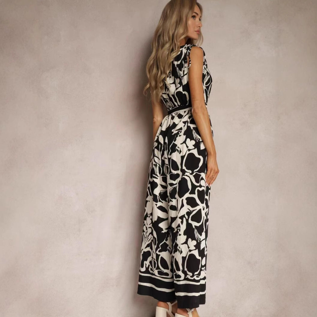 Combinaison femme – Sans manches – Décolleté en V – Taille nouée – Coupe fluide imprimée Francis-Laurent. Élégante et confortable, cette combinaison imprimée sans manches avec décolleté en V et taille nouée offre une coupe fluide parfaite pour toutes occasions.