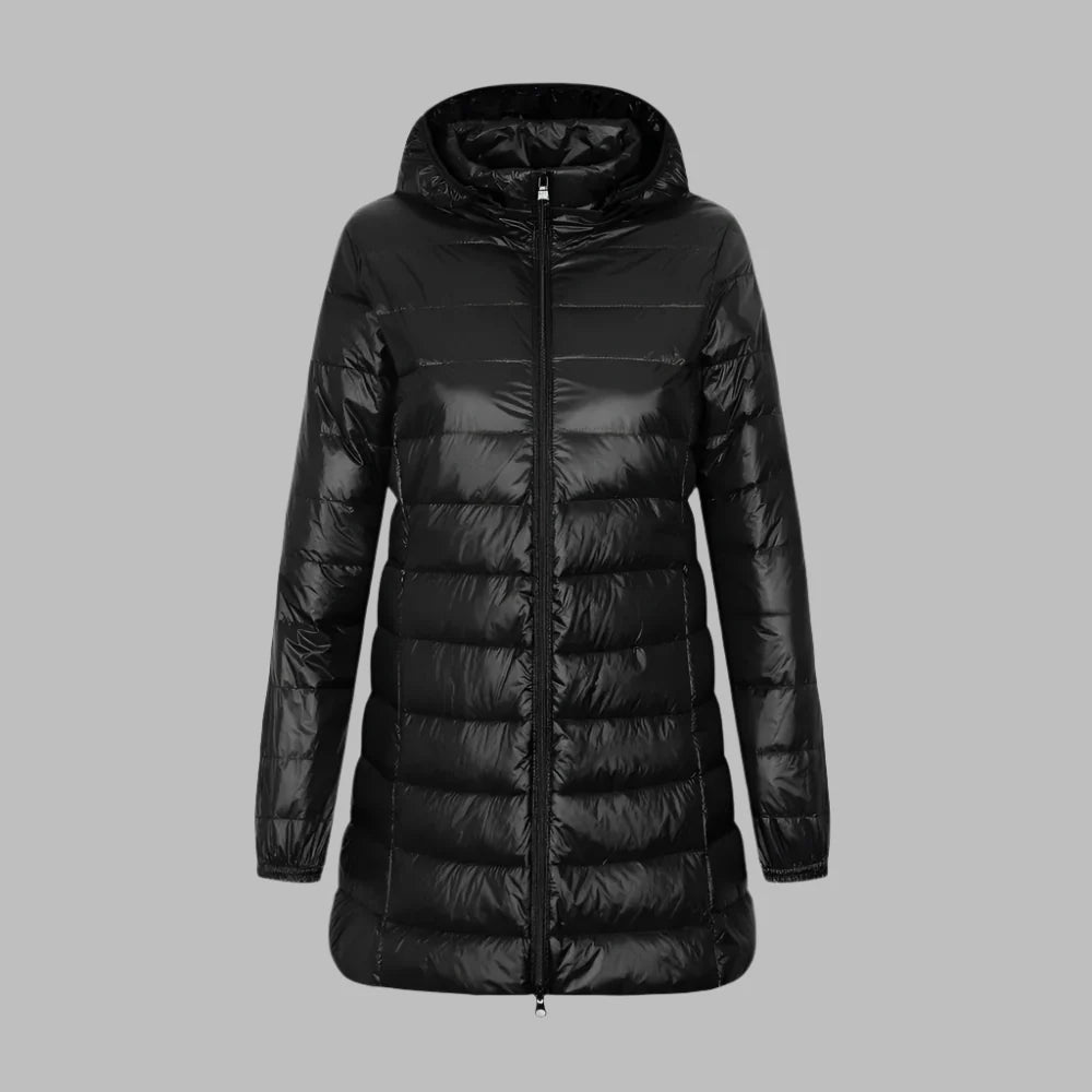 - Design : Coupe ajustée, longueur mi-cuisse, matelassée avec capuche