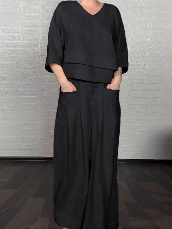 Ensemble Femme Décontracté – Haut V Col Oversize – Pantalon Large Taille Haute – Coton Lin