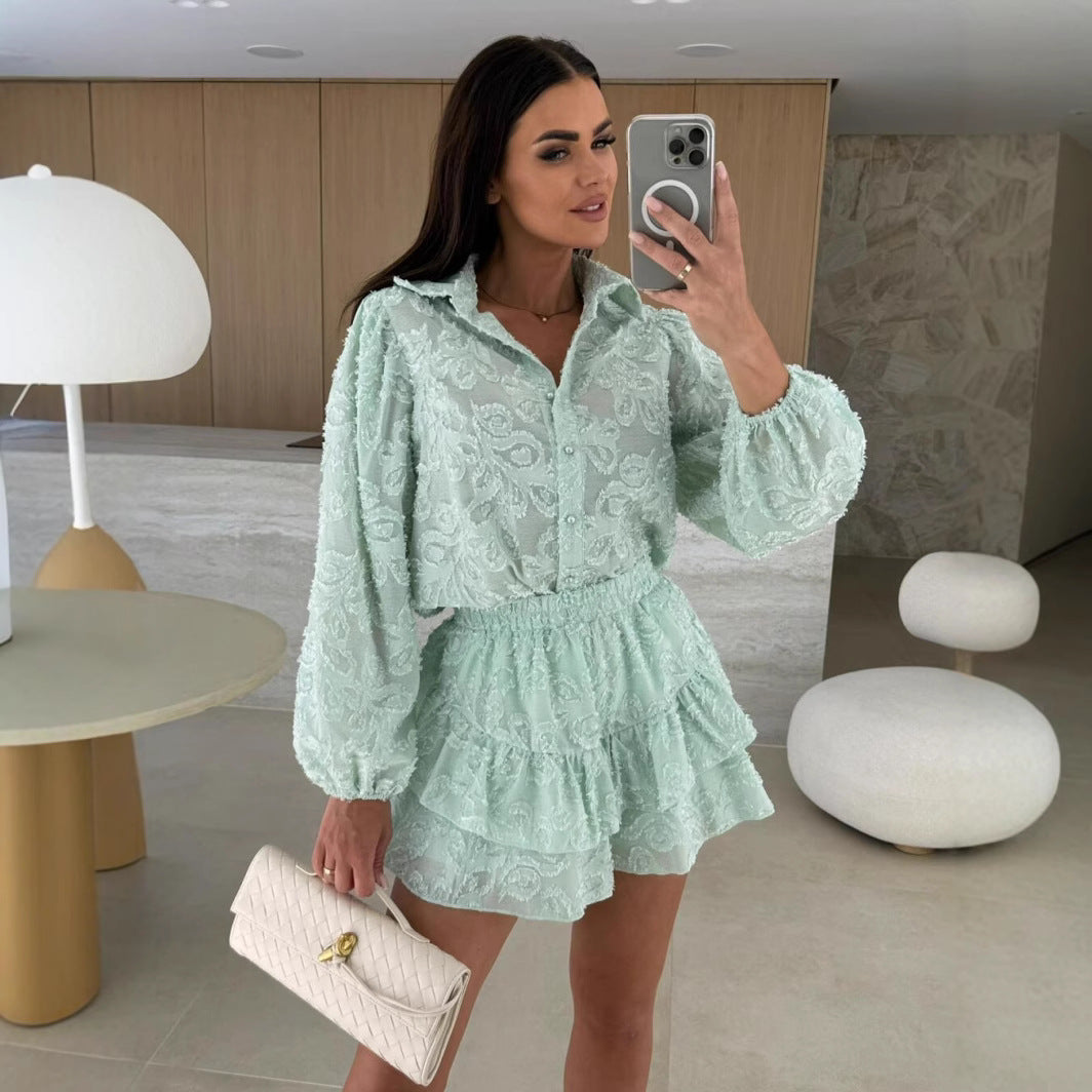 Ensemble Femme Dentelle - Haut Manches Longues & Jupe Volants. Adoptez un look féminin et élégant avec cet ensemble deux pièces en dentelle respirante. Le haut à manches longues et poignets bouffants s'associe à une mini-jupe à volants pour une allure sophistiquée et tendance.