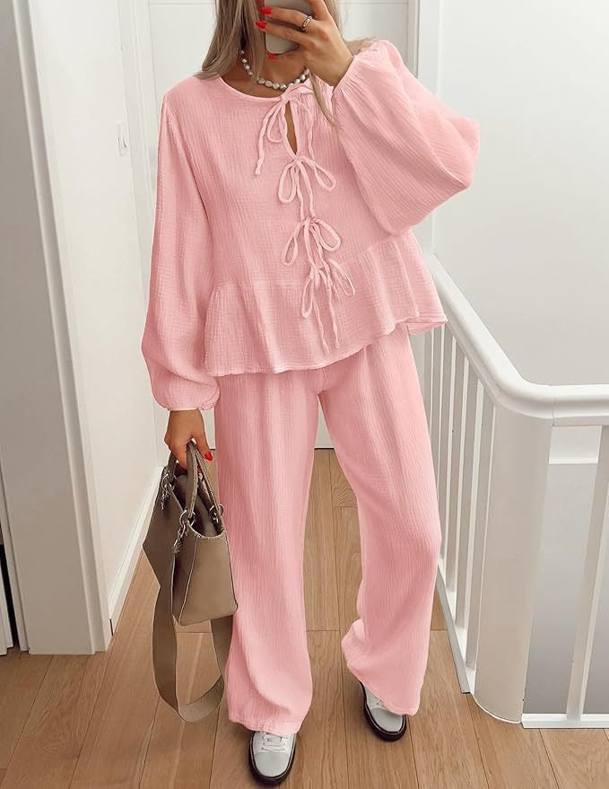 Ensemble femme – Haut col V à liens nœuds manches longues – Pantalon large taille haute