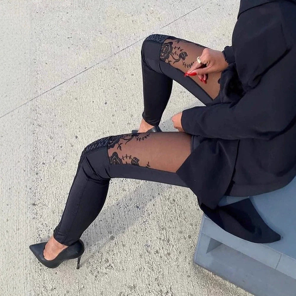 Ce pantalon pour femme présente une coupe slim en tissu stretch, agrémentée d'inserts en dentelle fleurie.