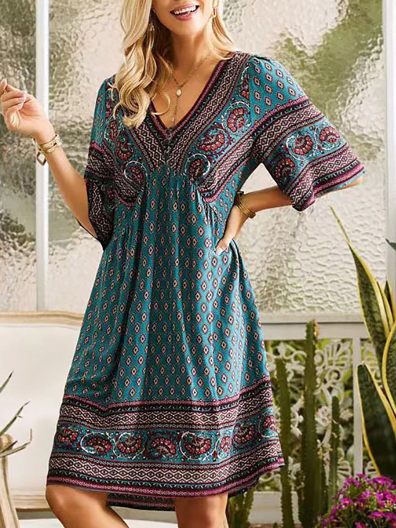 Cette mini-robe d'inspiration bohème arbore un imprimé ethnique vibrant, un décolleté en V fluide et des manches courtes fluides, parfaites pour un look décontracté et élégant. Que vous alliez à un brunch estival ou à une escapade le week-end, sa coupe décontractée vous assure un confort tout au long de la journée avec une touche de charme.
