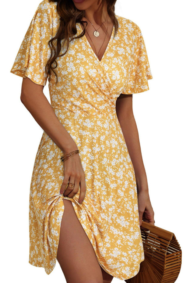 Laissez-vous séduire par le charme de cette robe fleurie pour femme, parfaite pour les sorties estivales. Sa coupe évasée flatteuse, son col en V décoratif et ses manches courtes allient confort et style, ce qui en fait un incontournable de votre garde-robe.
