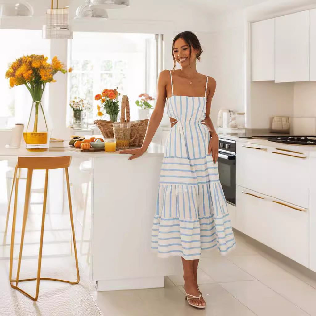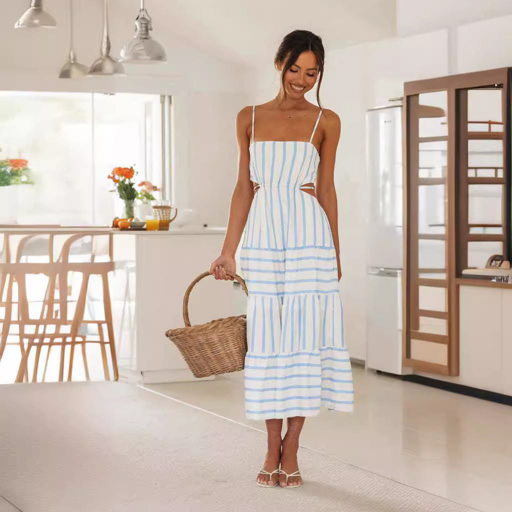 Robe Longue Été – Coupe Évasée – Bretelles Fines – Taille Découpée – Jupe à Volants. Adoptez cette robe longue et légère à la coupe flatteuse. Ses bretelles fines, sa taille découpée et sa jupe à volants vous offriront une allure féminine et élégante idéale pour la saison estivale.