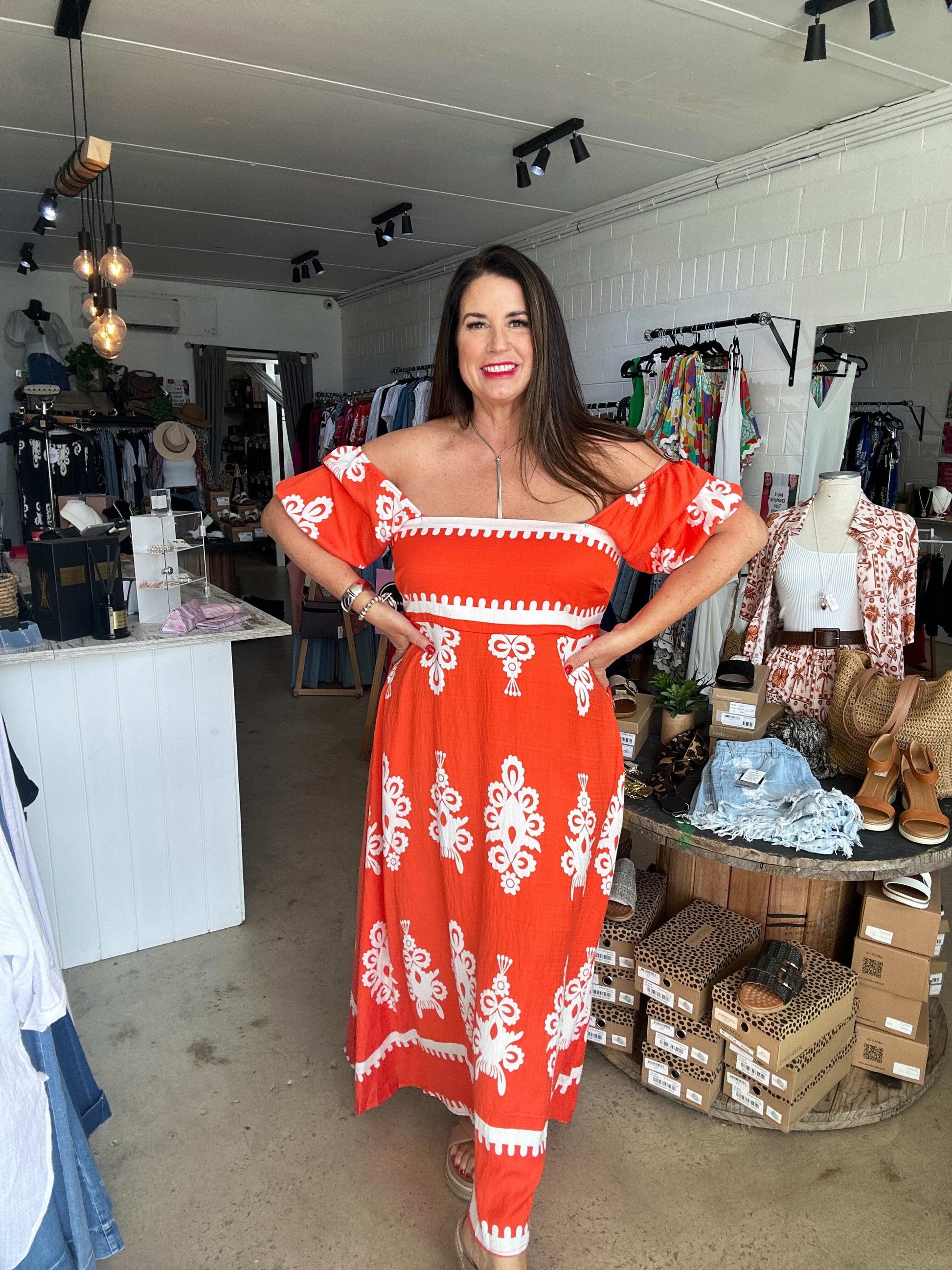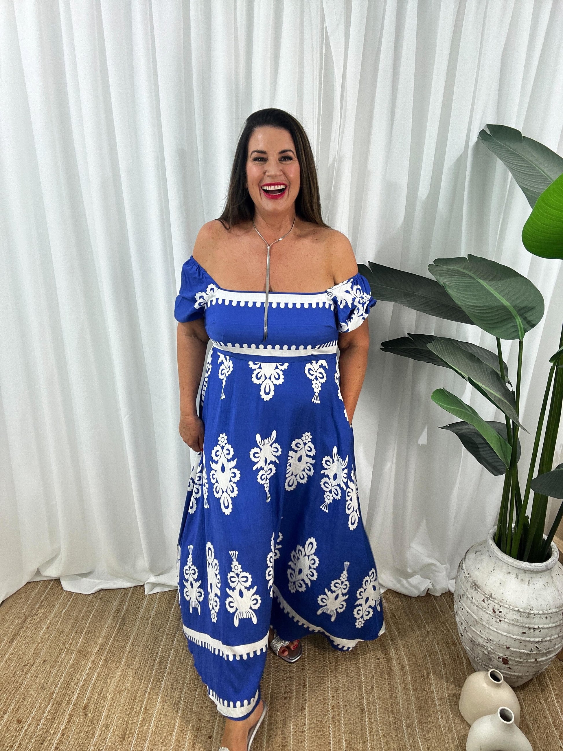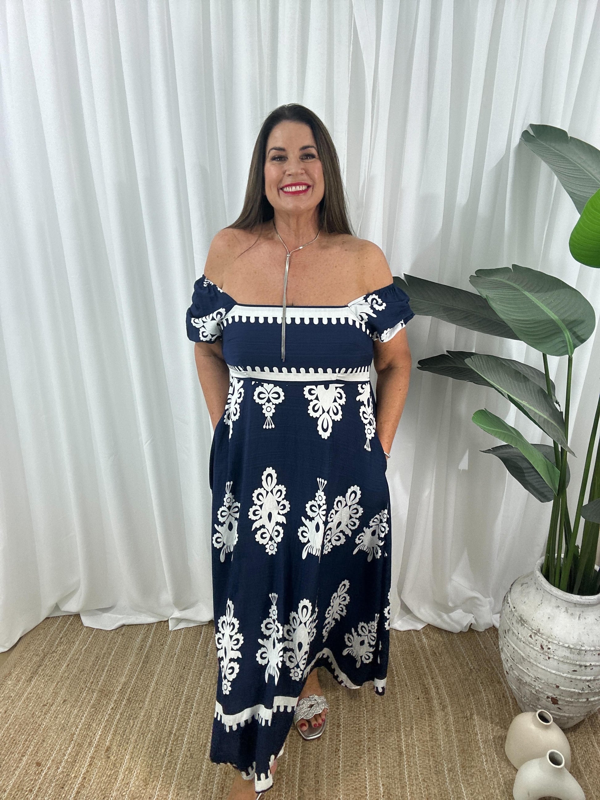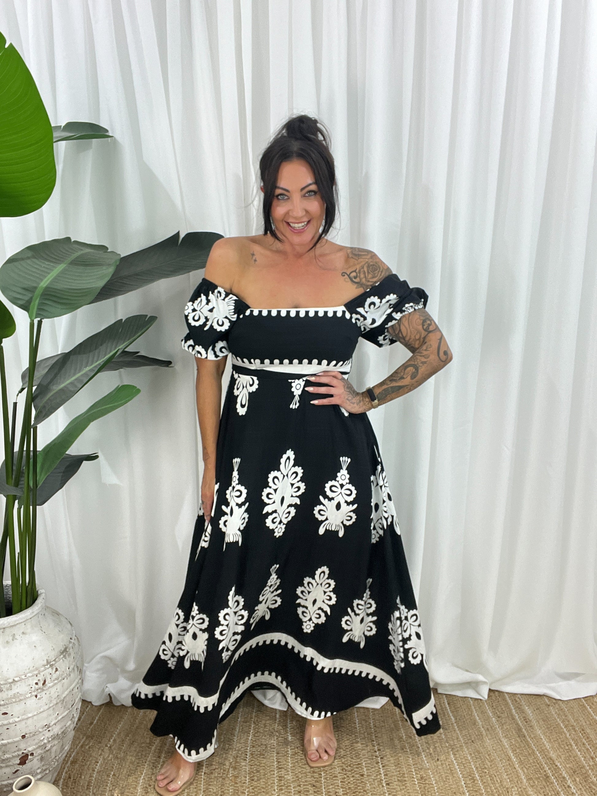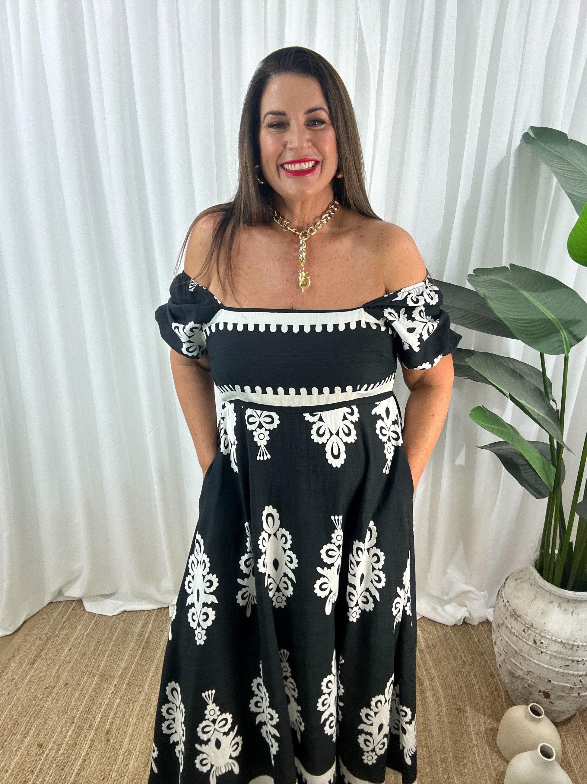 Robe Longue Femme - Épaules Dénudées - Manches Courtes Bouffantes - Fluide et Élégante. Élégante robe maxi à épaules dénudées avec des manches bouffantes courtes et un imprimé symétrique. Parfaite pour une allure estivale décontractée et féminine.