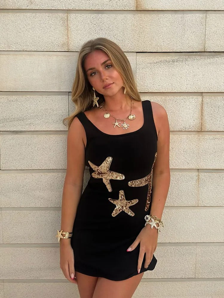 Robe mini femme – Coupe moulante – Sans manches – Ourlet ondulé – Détails étoile de mer. Cette robe moulante sans manches met en valeur votre silhouette avec son ourlet ondulé et ses détails étoile de mer. Idéale pour une soirée élégante ou une sortie estivale, elle vous assure un look tendance et féminin.
