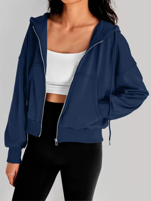 Sweat à capuche zippé femme – Coupe décontractée – Longueur courte – Tissu respirant